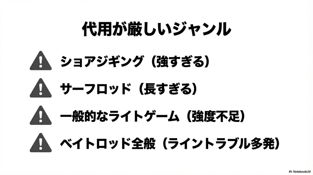 代表的な代用例としては、シーバスロッド、ハードロックフィッシュロッド、チニングロッドなどが挙げられます。