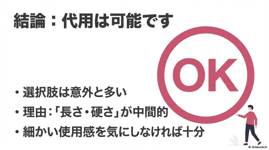 そのため、細かい使用感をあまり気にしないのであれば、長さやパワー感がざっくり合っているだけでも十分成立します。