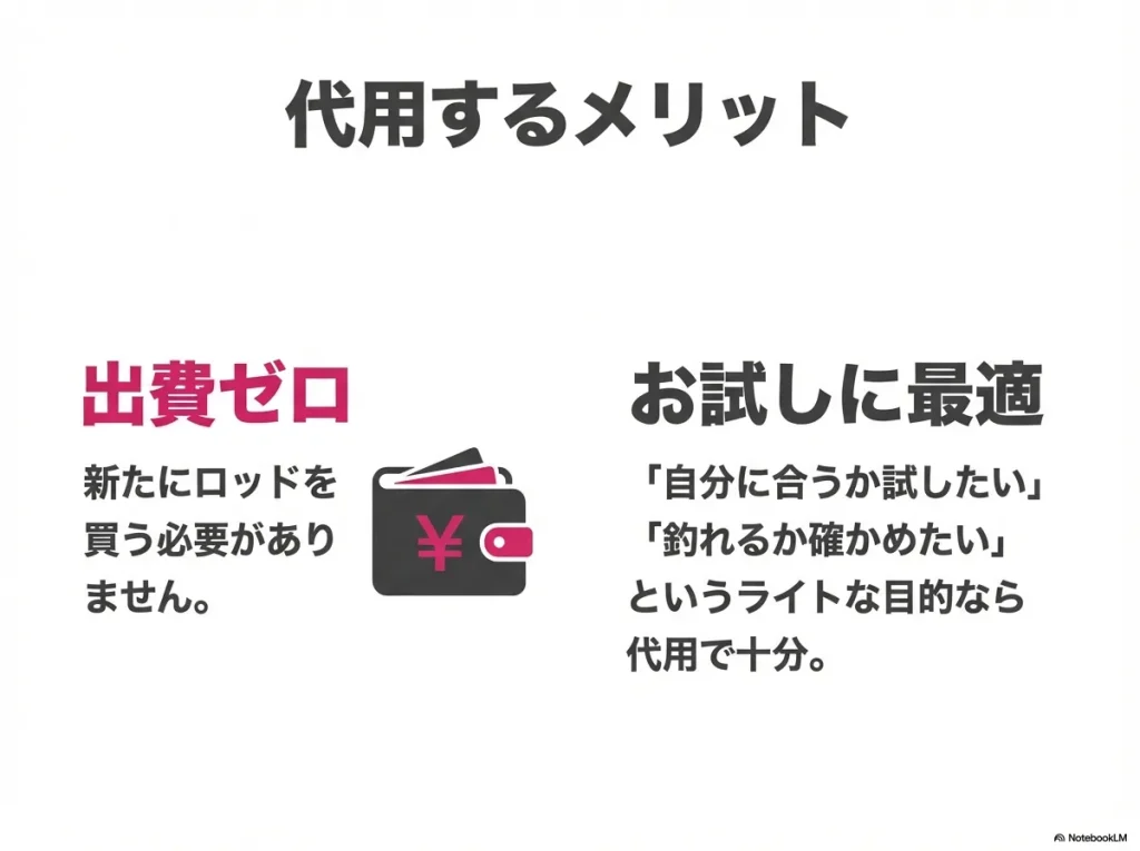 「エギングが自分に合うか試したい」「この釣り場で本当にイカが釣れるのか確かめたい」といったライトな目的なら、まずは代用ロッドで十分でしょう。