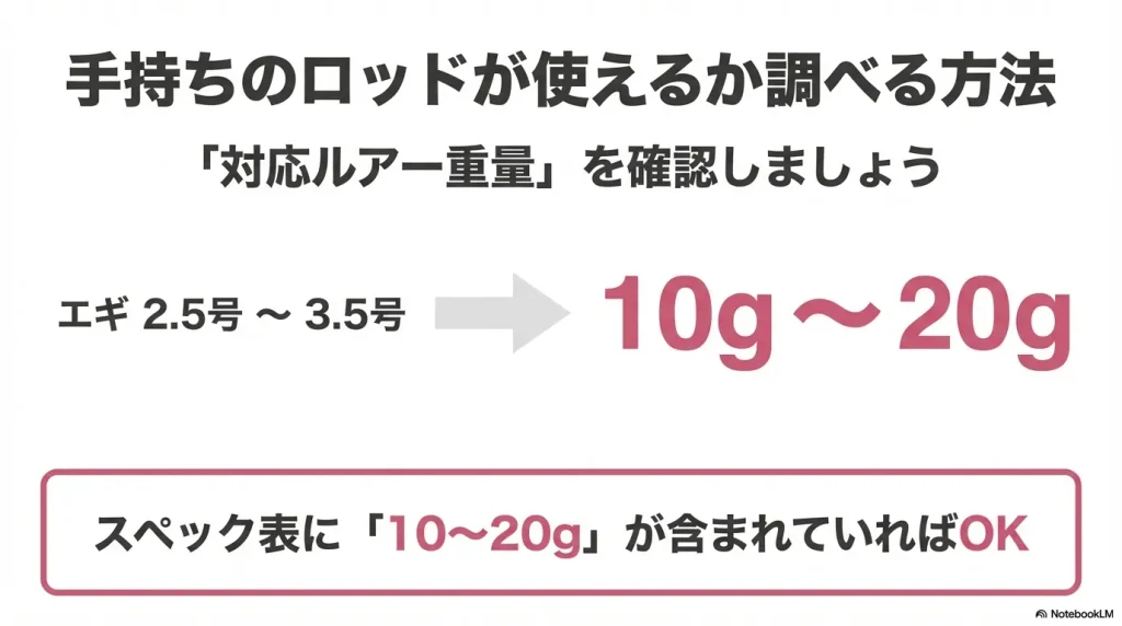手持ちのロッドでエギングができるか判断するなら、まずは**「対応ルアー重量」と「使いたいエギの号数」**を照合するのが一番わかりやすいです。