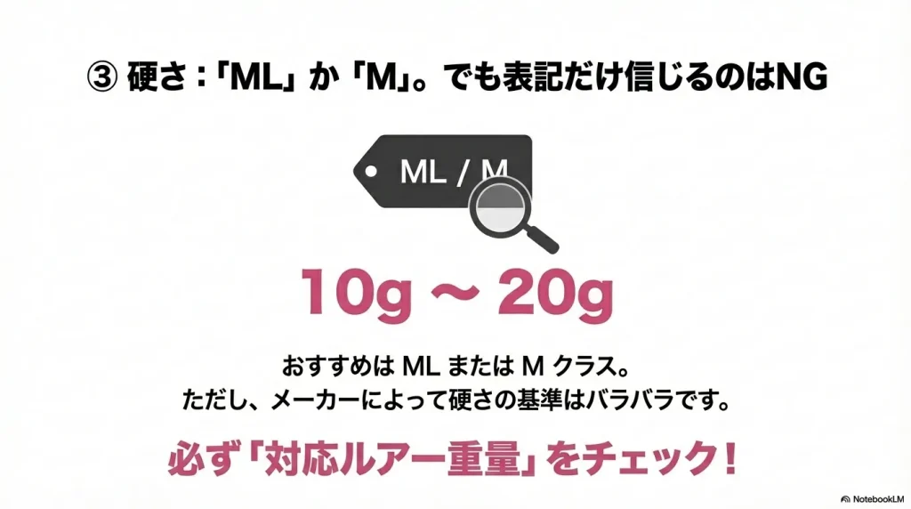 ただし硬さ表記はメーカーごとに差があるため、ML・Mという表記だけで判断せず、対応ルアー重量も必ず確認しましょう。