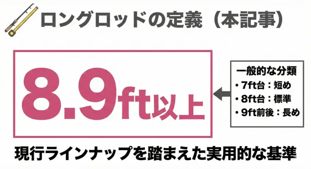 9ft以上のモデルは実際にはかなり少なく、現行ラインナップを踏まえると、8.9ft(8ft9in)以上をロングロッドと考えるのが実用的です。