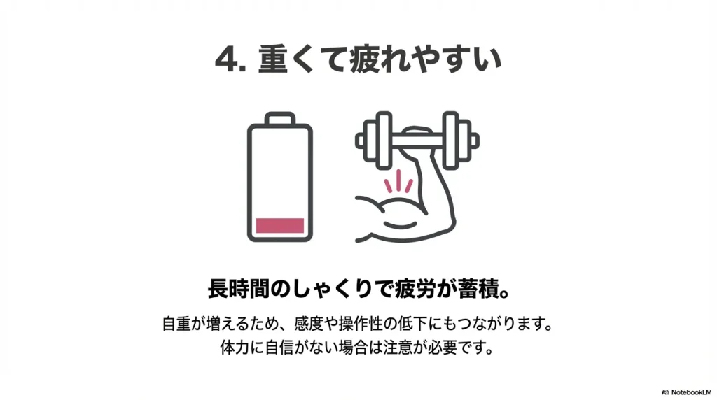 また、重さは感度や操作性の低下にもつながるため、この点もネガティブ要素です。