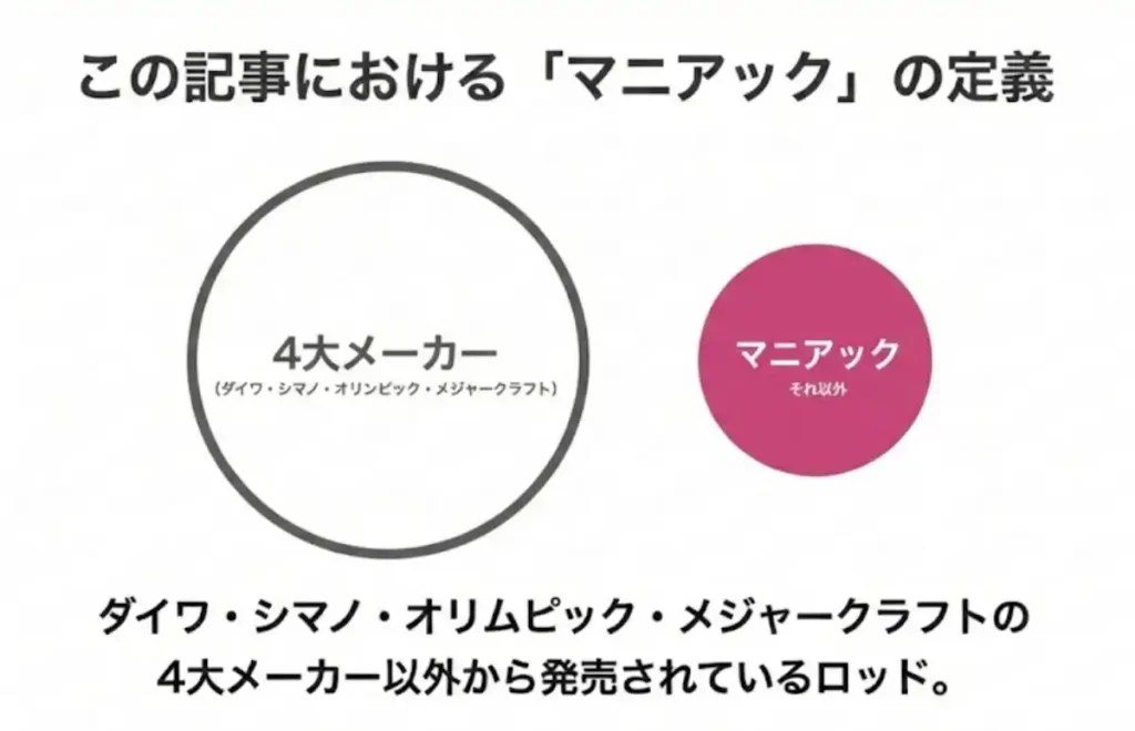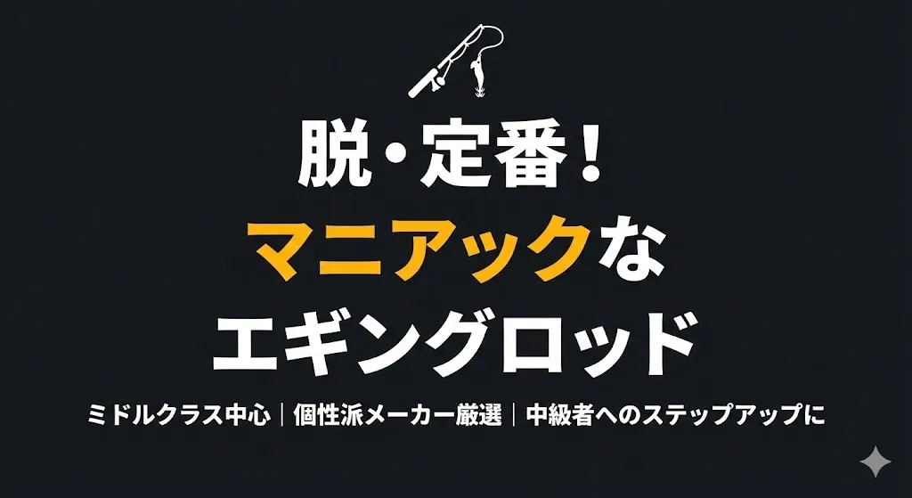この4大メーカーという区分はあくまで筆者の独自基準であり、エギング業界の公式な分類ではありません。人によっては「極端に尖ったスペックのロッド」や「生産本数が少なく入手困難なロッド」をマニアックと呼ぶこともあります。