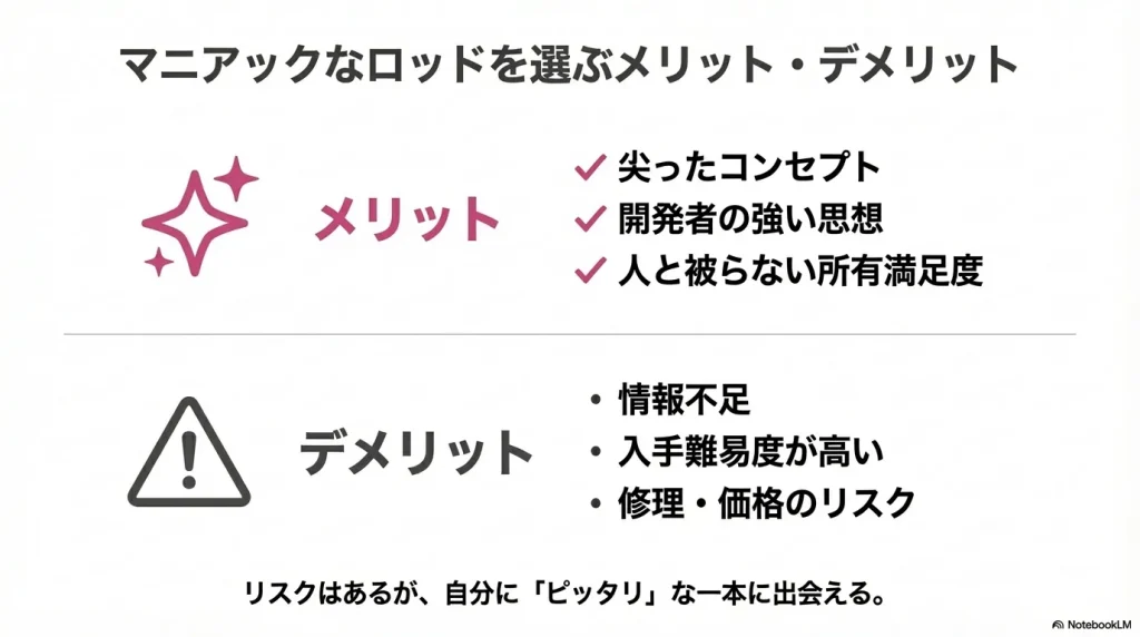 人と被りにくい満足感がメリットだと感じるなら、マニアックロッドは十分選ぶ価値があります。
