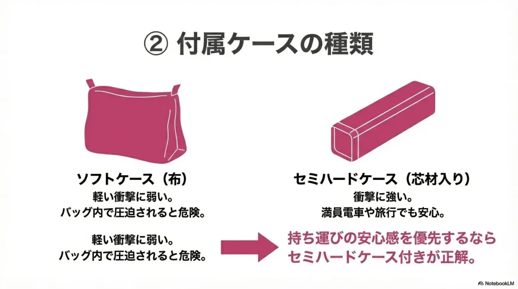 布製の軽い袋タイプ。軽量でかさばらないのがメリットだが、外部からの衝撃には弱い。トートバッグやスーツケースにそのまま入れると、圧迫や衝撃で破損するリスクがある。 - セミハードケース: